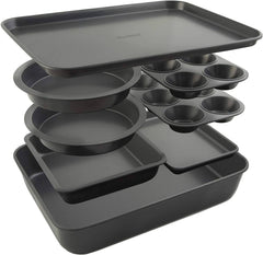The Baking brick set includes: - 1 large roasting pan - 1 8” sq. cake tin - 1 small oven tray - 2 muffin pans - 2 8” round cake tins - 1 large oven tray The baking set is made from non-stick carbon steel.