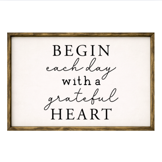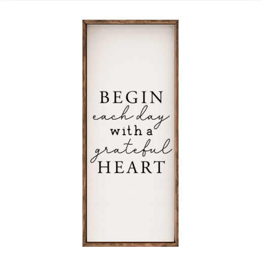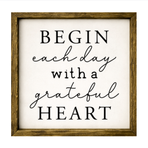 Our Begin Each Day With A Grateful Heart sign features elegant white lettering on a dark background framed in a handcrafted rustic wood box frame. The classic contrast of modern script with distressed wood makes this piece versatile for farmhouse, modern, or traditional décor styles. Each sign is built as a finished wood box, giving it depth, durability, and a high-end boutique feel. Designed to be displayed effortlessly—hang it directly from the frame or let it stand freely on a shelf, mantel, or table.