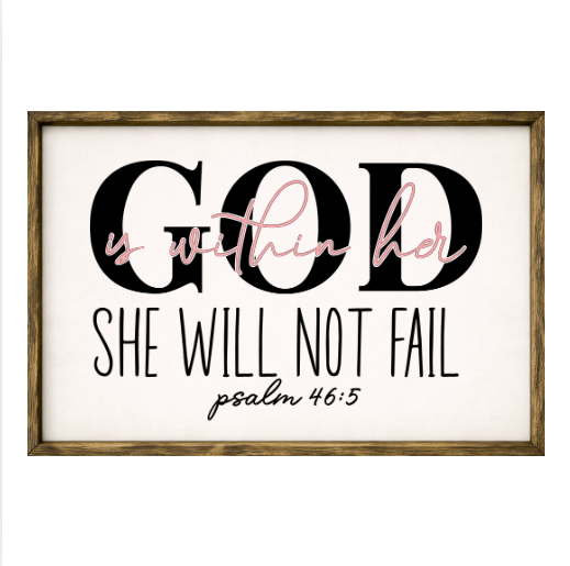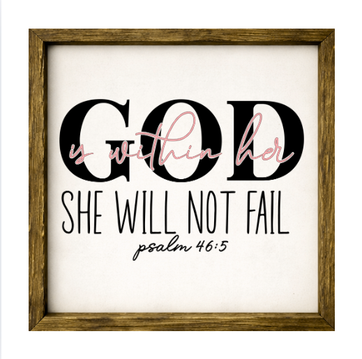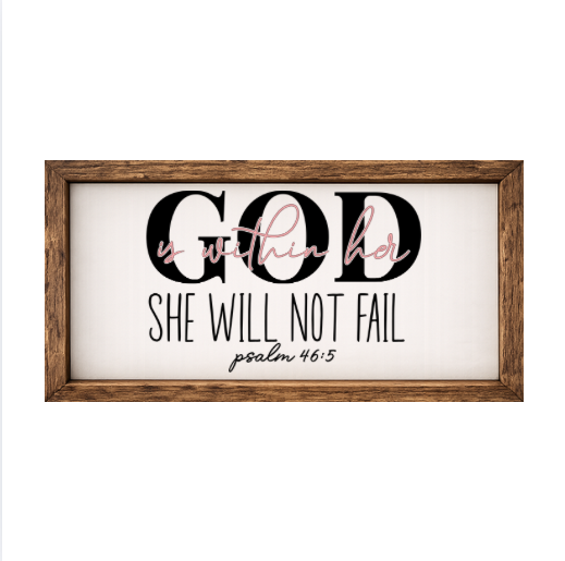 Our God Is With Her She Will Not Fail sign features elegant white lettering on a dark background framed in a handcrafted rustic wood box frame. The classic contrast of modern script with distressed wood makes this piece versatile for farmhouse, modern, or traditional décor styles. Each sign is built as a finished wood box, giving it depth, durability, and a high-end boutique feel. Designed to be displayed effortlessly—hang it directly from the frame or let it stand freely on a shelf, mantel, or table.