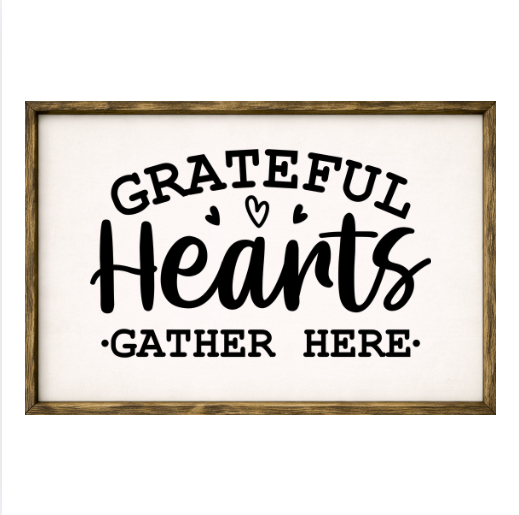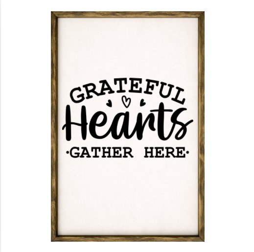 Our Grateful Hearts Gather Here sign features elegant white lettering on a dark background framed in a handcrafted rustic wood box frame. The classic contrast of modern script with distressed wood makes this piece versatile for farmhouse, modern, or traditional décor styles. Each sign is built as a finished wood box, giving it depth, durability, and a high-end boutique feel. Designed to be displayed effortlessly—hang it directly from the frame or let it stand freely on a shelf, mantel, or table.