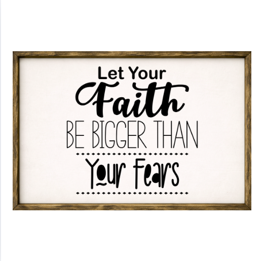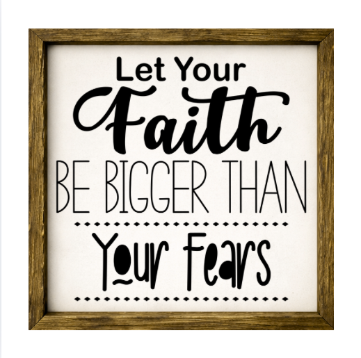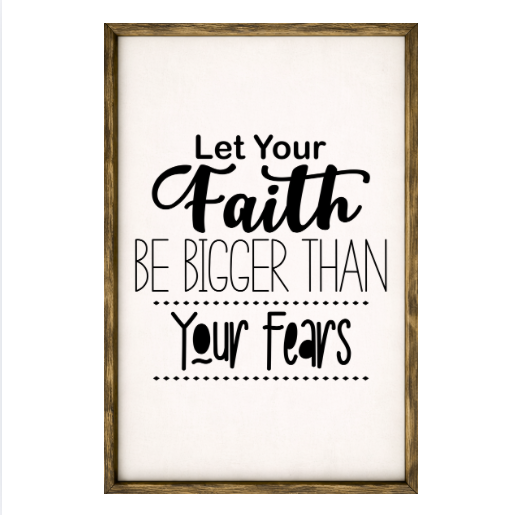 Our Let Your Faith Be Bigger Than Your Fears sign features elegant white lettering on a dark background framed in a handcrafted rustic wood box frame. The classic contrast of modern script with distressed wood makes this piece versatile for farmhouse, modern, or traditional décor styles. Each sign is built as a finished wood box, giving it depth, durability, and a high-end boutique feel. Designed to be displayed effortlessly—hang it directly from the frame or let it stand freely on a shelf, mantel, or table.