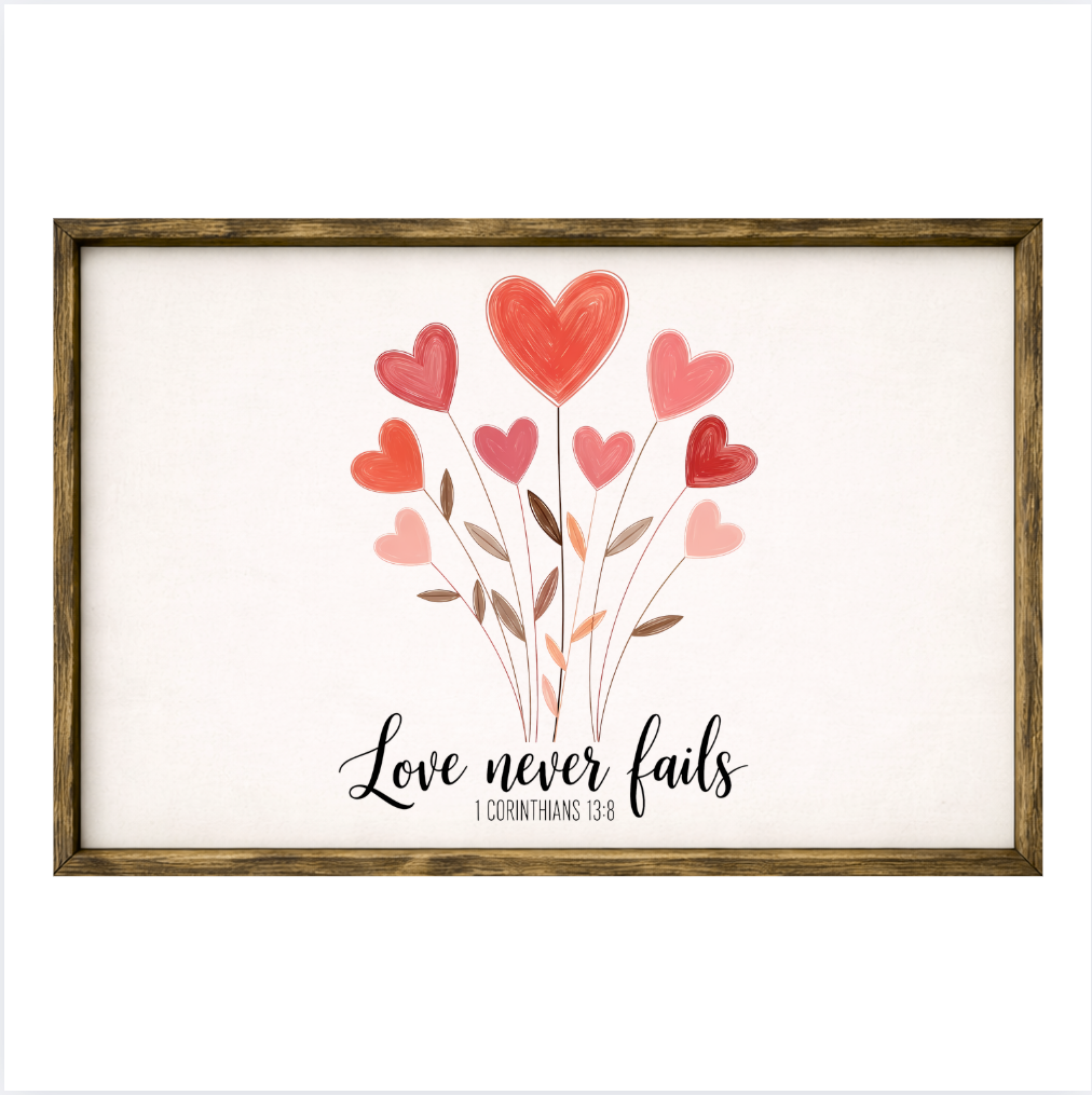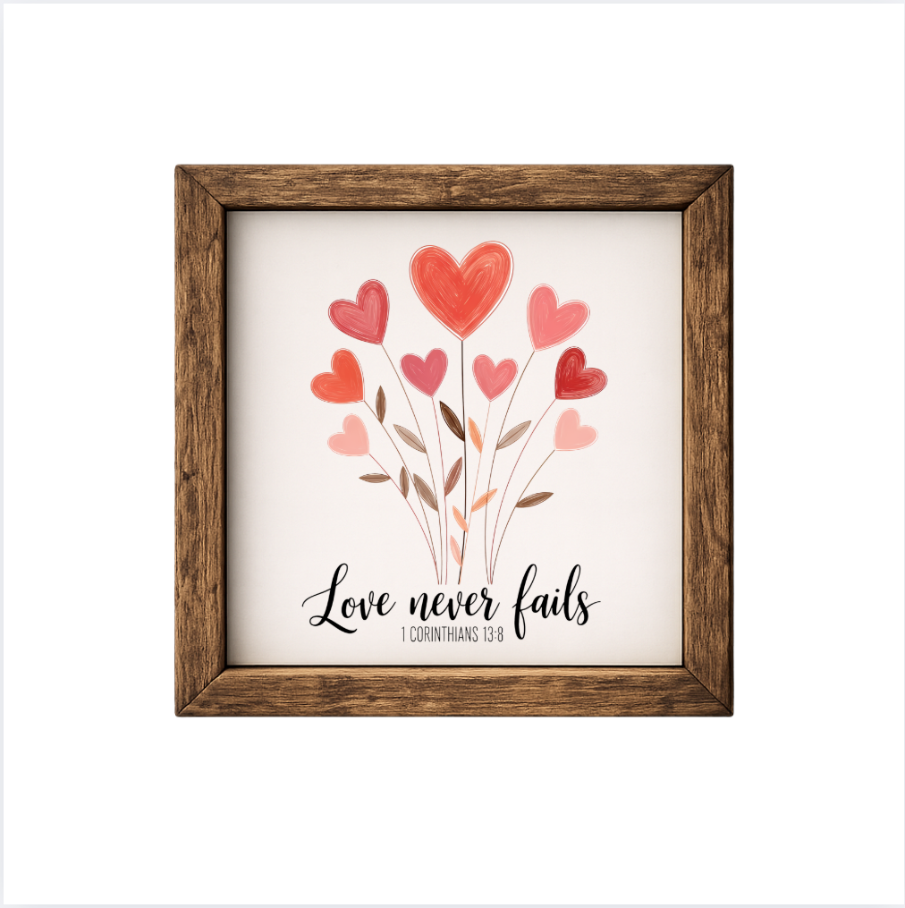 Our Love Never Fails Are Possible sign features elegant white lettering on a dark background framed in a handcrafted rustic wood box frame. The classic contrast of modern script with distressed wood makes this piece versatile for farmhouse, modern, or traditional décor styles. Each sign is built as a finished wood box, giving it depth, durability, and a high-end boutique feel. Designed to be displayed effortlessly—hang it directly from the frame or let it stand freely on a shelf, mantel, or table.