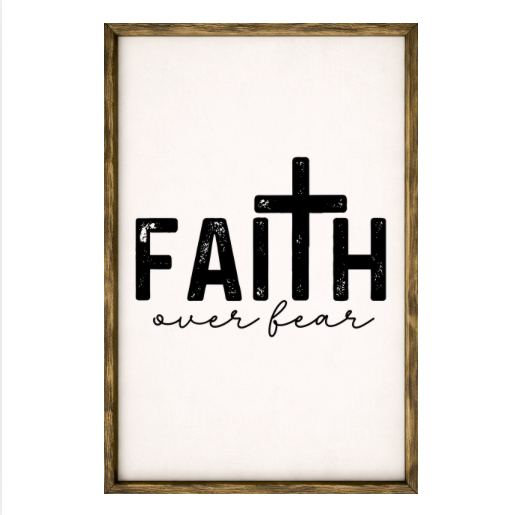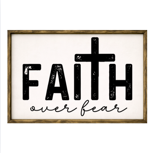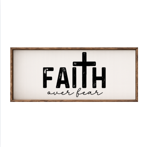 Our Faith Over Fear sign features elegant white lettering on a dark background framed in a handcrafted rustic wood box frame. The classic contrast of modern script with distressed wood makes this piece versatile for farmhouse, modern, or traditional décor styles. Each sign is built as a finished wood box, giving it depth, durability, and a high-end boutique feel. Designed to be displayed effortlessly—hang it directly from the frame or let it stand freely on a shelf, mantel, or table.