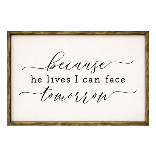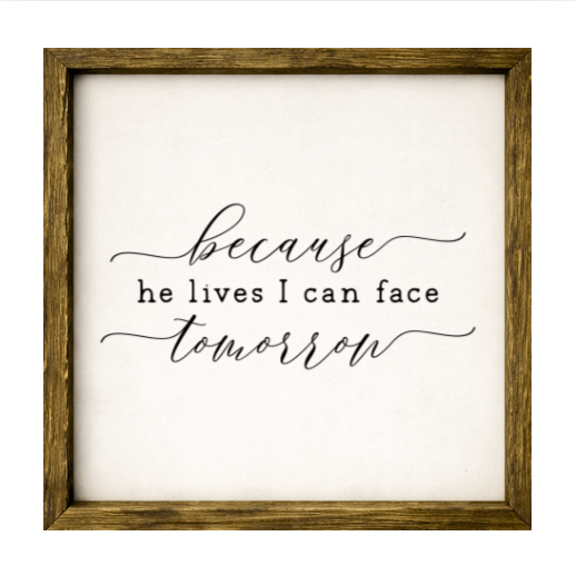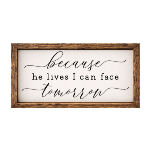 Our Because He Lives I Can Face Tomorrow sign features elegant white lettering on a dark background framed in a handcrafted rustic wood box frame. The classic contrast of modern script with distressed wood makes this piece versatile for farmhouse, modern, or traditional décor styles. Each sign is built as a finished wood box, giving it depth, durability, and a high-end boutique feel. Designed to be displayed effortlessly—hang it directly from the frame or let it stand freely on a shelf, mantel, or table.