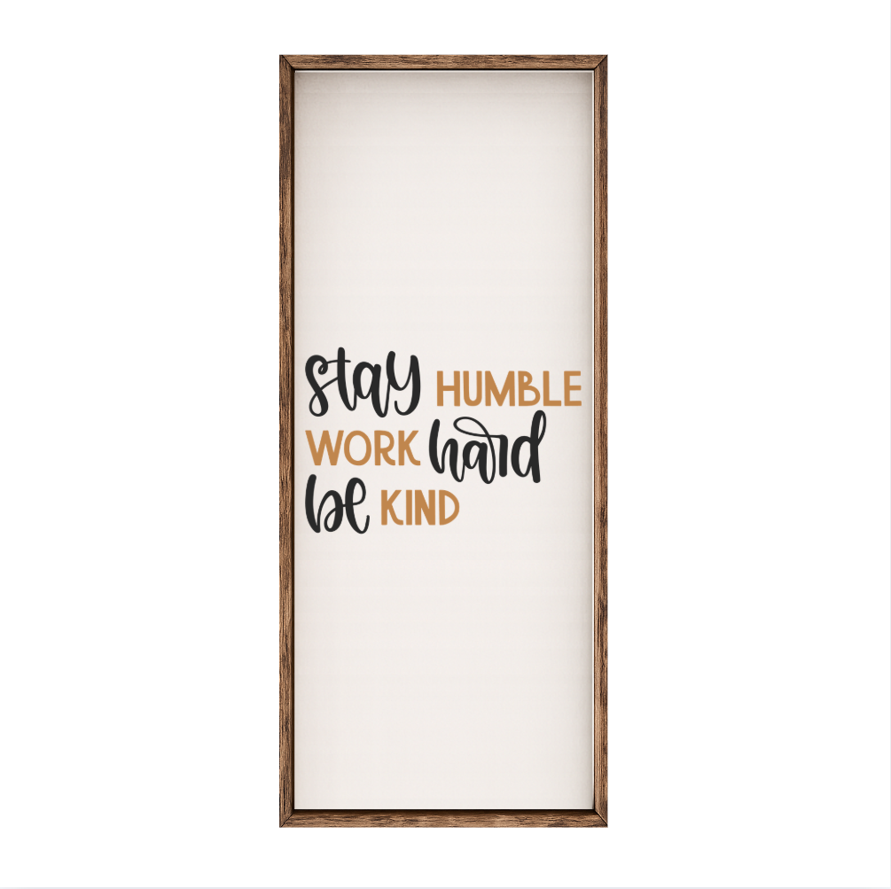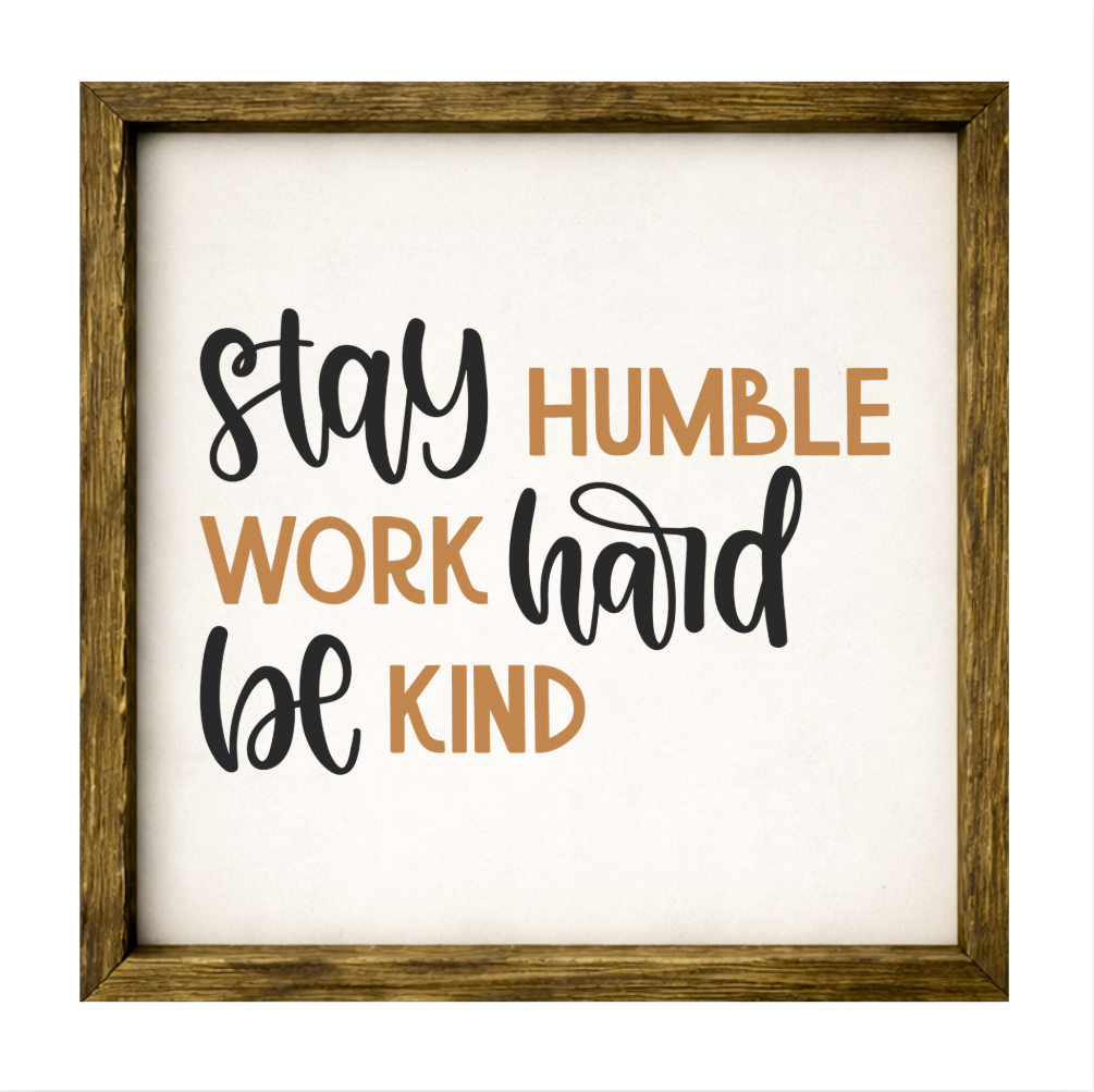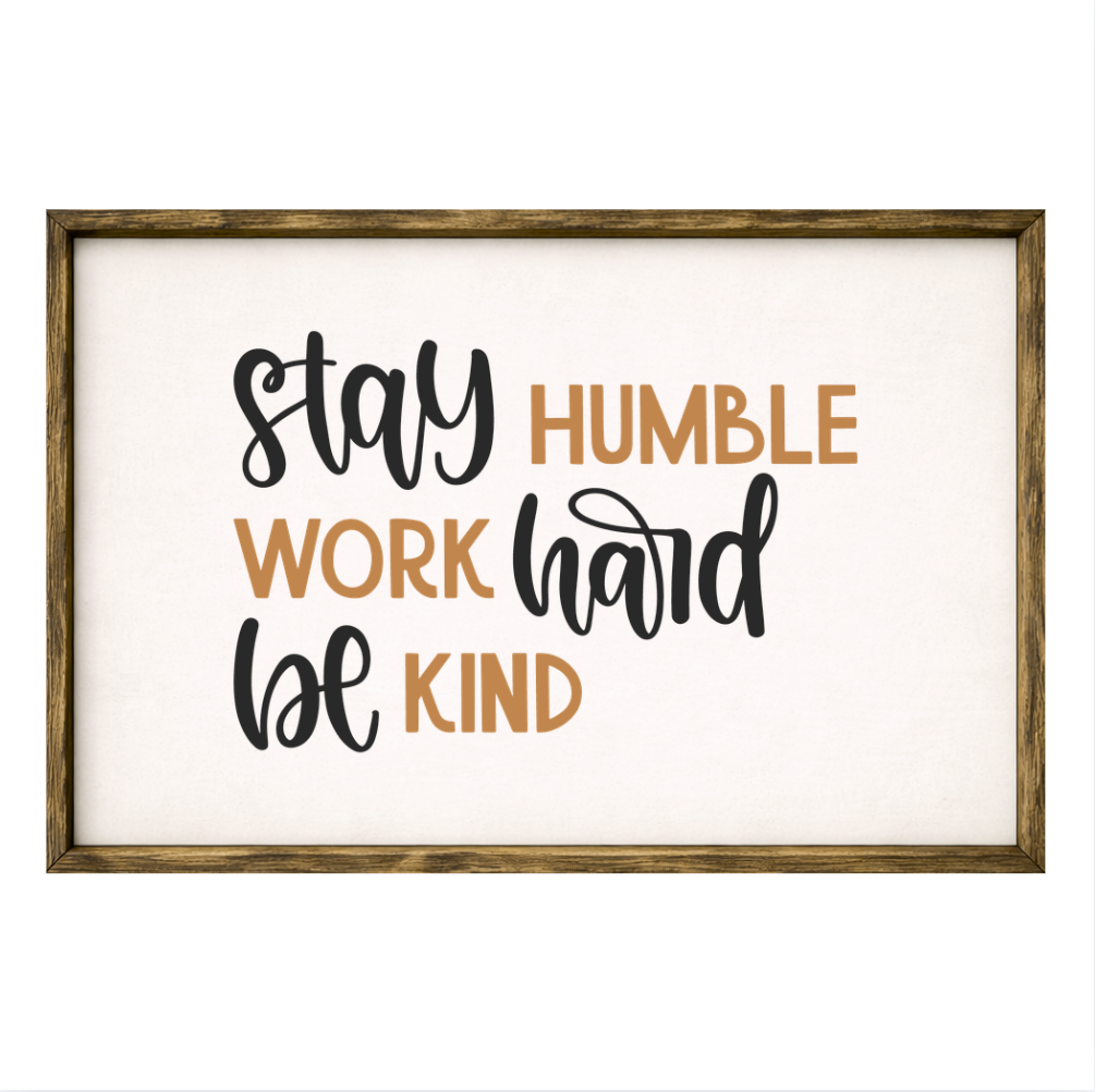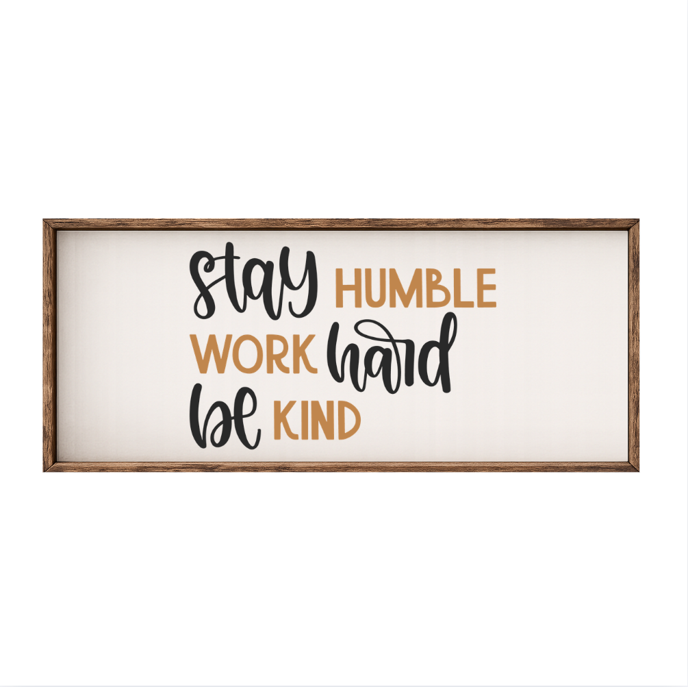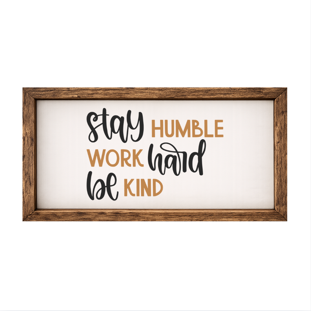 Our Stay Humble Work Hard Be Kind sign features elegant white lettering on a dark background framed in a handcrafted rustic wood box frame. The classic contrast of modern script with distressed wood makes this piece versatile for farmhouse, modern, or traditional décor styles. Each sign is built as a finished wood box, giving it depth, durability, and a high-end boutique feel. Designed to be displayed effortlessly—hang it directly from the frame or let it stand freely on a shelf, mantel, or table.