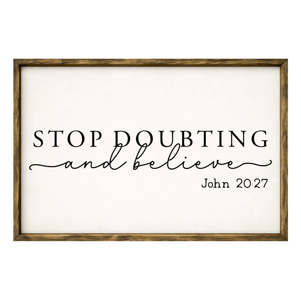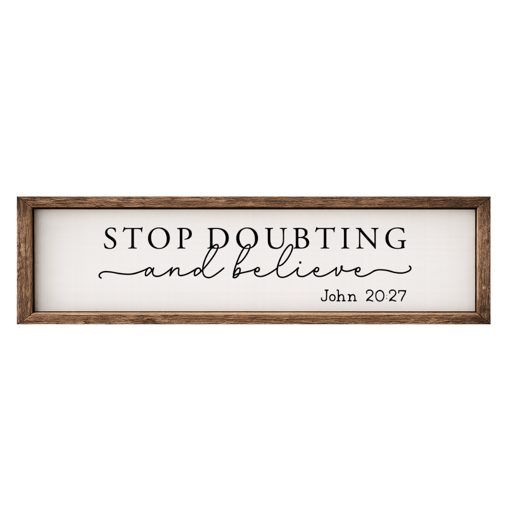 Our Stop Doubting and Believe sign features elegant white lettering on a dark background framed in a handcrafted rustic wood box frame. The classic contrast of modern script with distressed wood makes this piece versatile for farmhouse, modern, or traditional décor styles. Each sign is built as a finished wood box, giving it depth, durability, and a high-end boutique feel. Designed to be displayed effortlessly—hang it directly from the frame or let it stand freely on a shelf, mantel, or table.