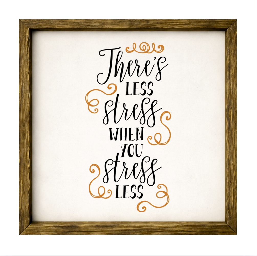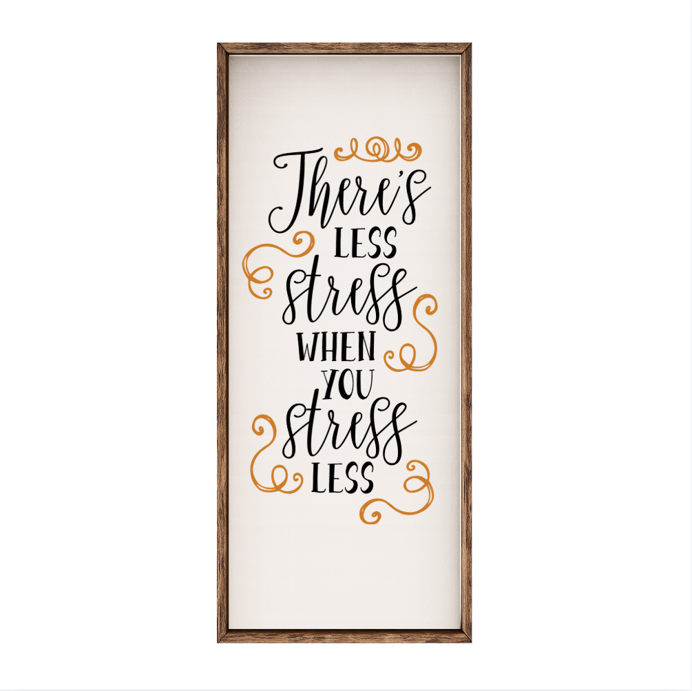 Our There's Less Stress sign features elegant white lettering on a dark background framed in a handcrafted rustic wood box frame. The classic contrast of modern script with distressed wood makes this piece versatile for farmhouse, modern, or traditional décor styles. Each sign is built as a finished wood box, giving it depth, durability, and a high-end boutique feel. Designed to be displayed effortlessly—hang it directly from the frame or let it stand freely on a shelf, mantel, or table.