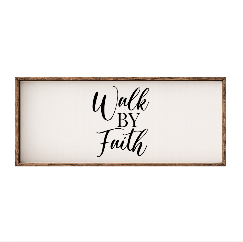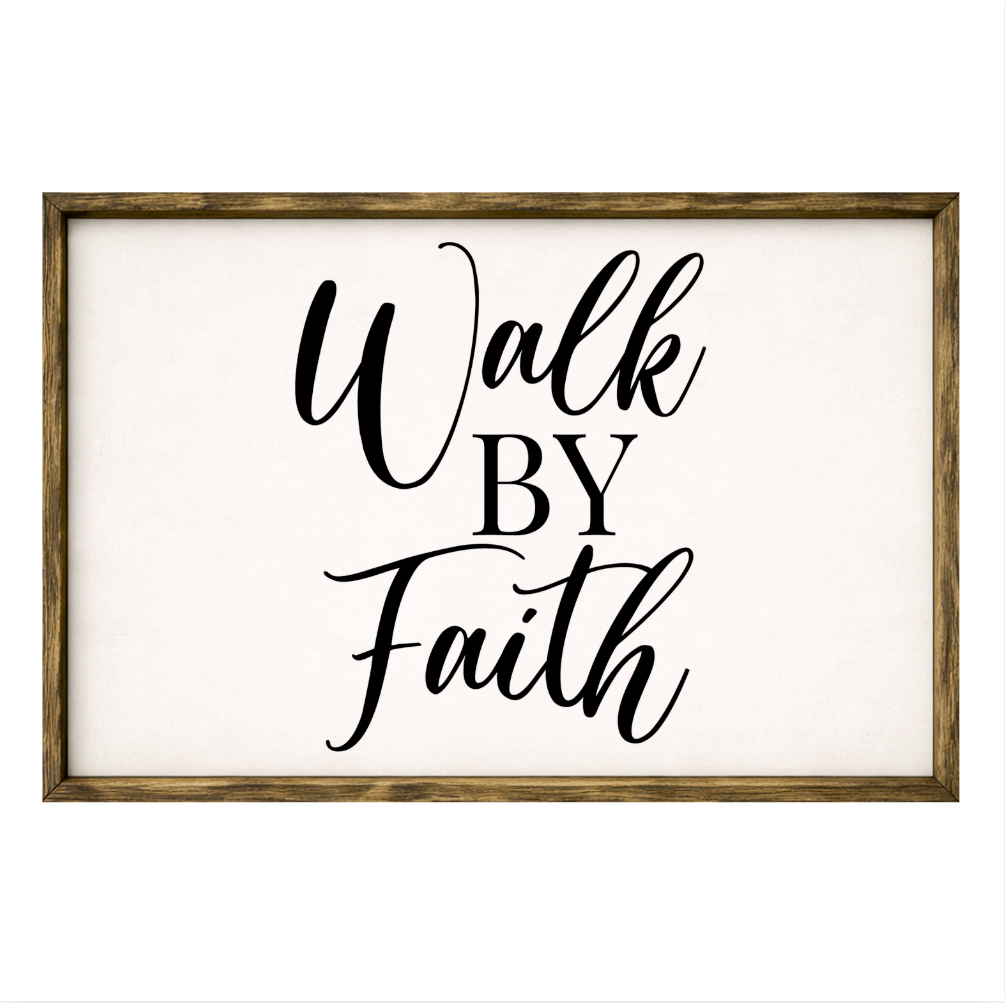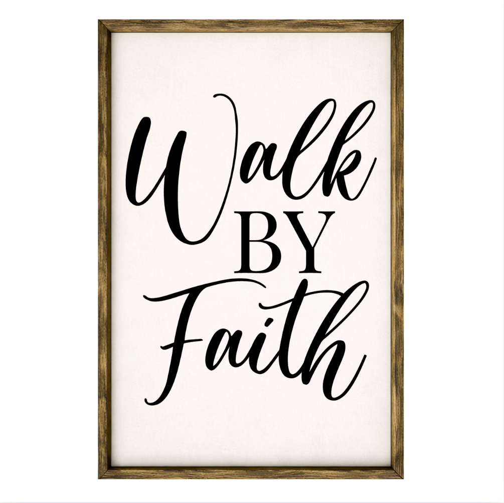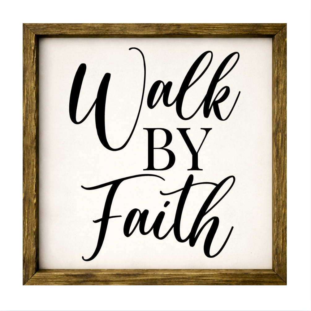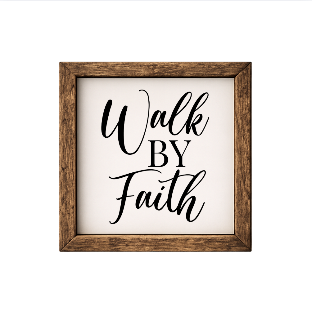 Our Walk By Faith sign features elegant white lettering on a dark background framed in a handcrafted rustic wood box frame. The classic contrast of modern script with distressed wood makes this piece versatile for farmhouse, modern, or traditional décor styles. Each sign is built as a finished wood box, giving it depth, durability, and a high-end boutique feel. Designed to be displayed effortlessly—hang it directly from the frame or let it stand freely on a shelf, mantel, or table.