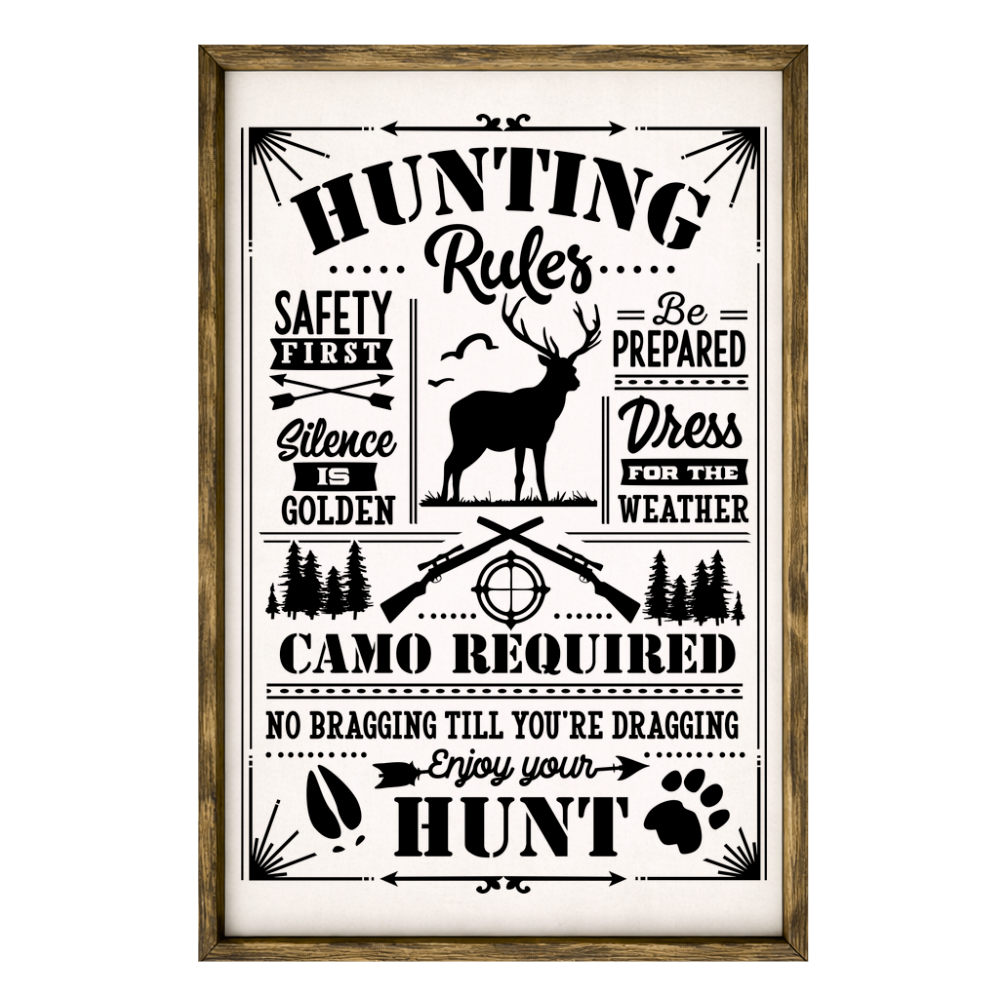 Our Hunting Rules sign blends respect for tradition with a bit of outdoorsman humor, featuring clean, easy-to-read lettering on a dark background framed in a handcrafted rustic wood box frame. The bold list — “Safety First, Silence Is Golden, Be Prepared, Dress for the Weather, Camo Required, No Bragging Till You’re Dragging, Enjoy Your Hunt” — makes this a great accent for hunting cabins, blinds, garages, or man caves. Each sign is built as a finished wood box for added depth, durability, and a boutique feel. Designed for effortless display — hang it directly from the frame or let it stand freely on a shelf, mantel, or table.