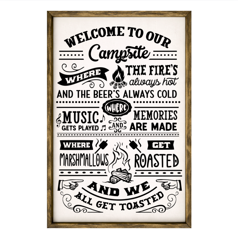 Our Welcome to Our Campsite sign sets the tone for good times around the fire, featuring clean, easy-to-read lettering on a dark background framed in a handcrafted rustic wood box frame. The playful, rhythmic message — “Welcome to our campsite, where the fire’s always hot and the beer’s always cold, where music gets played and memories are made, where marshmallows get roasted and we all get toasted” — brings personality, laughter, and nostalgia to any camping space. Each sign is built as a finished wood box for added depth, durability, and a boutique feel. Designed for effortless display — hang it directly from the frame or let it stand freely on a shelf, picnic table, camper counter, or mantel.