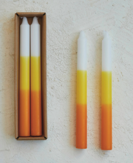 Add some charm and warmth to the home with these unscented taper candles in a box in white, yellow, and orange colors. This set features 2 taper candles in white, yellow, and orange that will brighten up the space. The candles are unscented for those who prefer a natural and subtle ambiance. The candles are made of high-quality wax and a cotton wick for a clean and even burn. The candles have an approximate burn time of 7 hours, for long-lasting enjoyment. The candles measure 10 inches in height and 1 inch in diameter. From adding a warm glow to gatherings to creating a calming atmosphere, this decorative candle adds a touch of magic to any space.