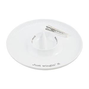 2-piece set. Textured ceramic platter with integral center dip cup. Comes with stamped stainless steel tongs.