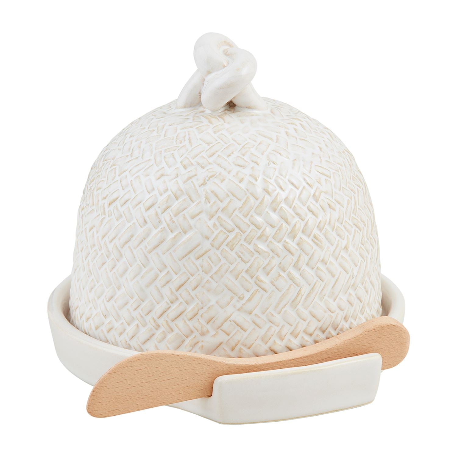 2-piece set. Reactive glaze stoneware cheese cloche and dish feature textured surface detail. Set comes with wooden spreader.