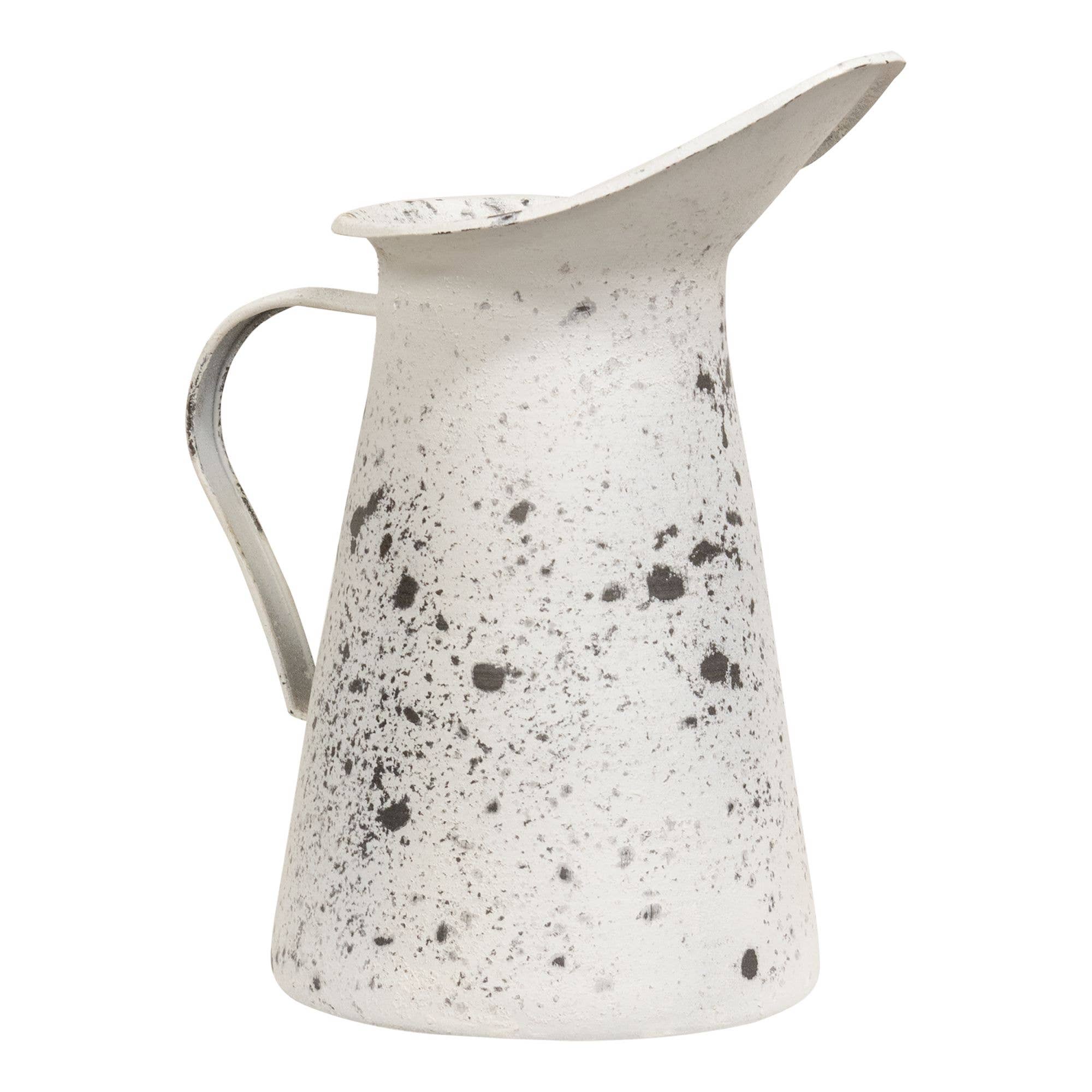 Distressed White Pitcher is made of metal and features a distressed white finish with bits of exposed metal. It has a large curved handle and it looks great alone or filled with a variety of floral arrangements.