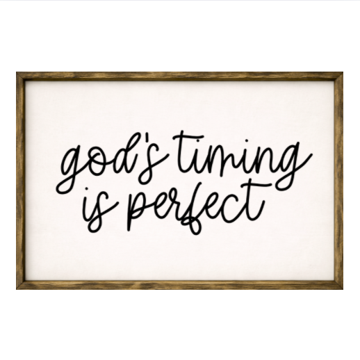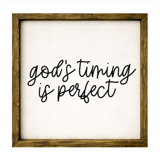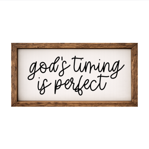 Our God's Timing is Perfect sign features elegant white lettering on a dark background framed in a handcrafted rustic wood box frame. The classic contrast of modern script with distressed wood makes this piece versatile for farmhouse, modern, or traditional décor styles. Each sign is built as a finished wood box, giving it depth, durability, and a high-end boutique feel. Designed to be displayed effortlessly—hang it directly from the frame or let it stand freely on a shelf, mantel, or table.