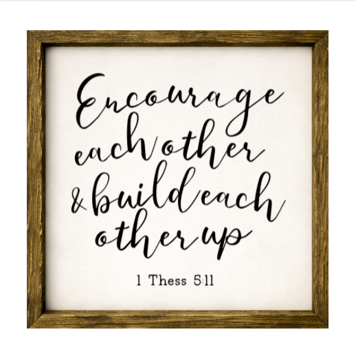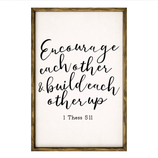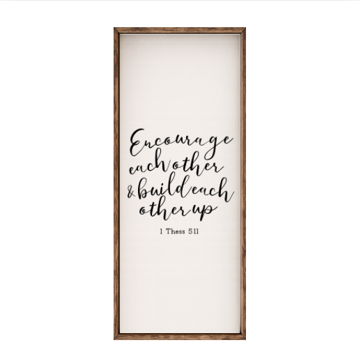 Our Encourage Each Other & Build Each Other Up sign features elegant white lettering on a dark background framed in a handcrafted rustic wood box frame. The classic contrast of modern script with distressed wood makes this piece versatile for farmhouse, modern, or traditional décor styles. Each sign is built as a finished wood box, giving it depth, durability, and a high-end boutique feel. Designed to be displayed effortlessly—hang it directly from the frame or let it stand freely on a shelf, mantel, or table.