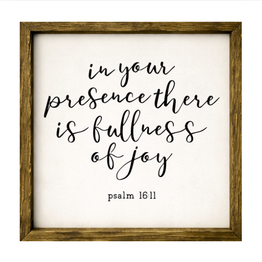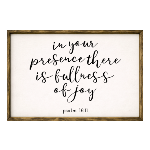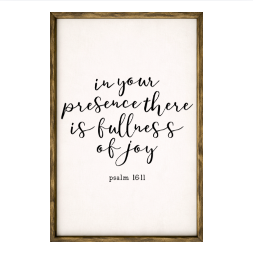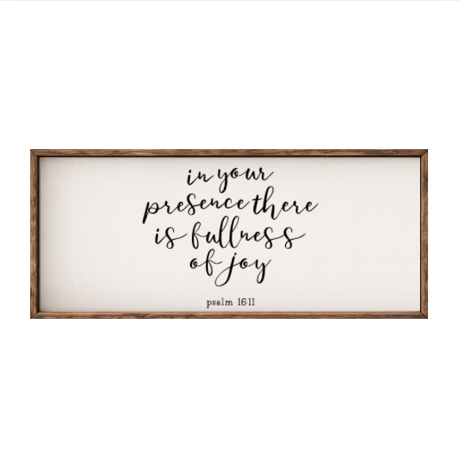 Our In Your Presence There is Fullness of Joy sign features elegant white lettering on a dark background framed in a handcrafted rustic wood box frame. The classic contrast of modern script with distressed wood makes this piece versatile for farmhouse, modern, or traditional décor styles. Each sign is built as a finished wood box, giving it depth, durability, and a high-end boutique feel. Designed to be displayed effortlessly—hang it directly from the frame or let it stand freely on a shelf, mantel, or table.