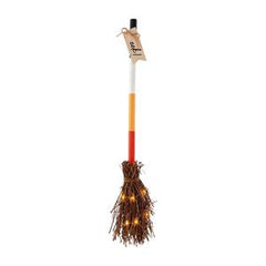 Wooden twig broom with canvas accent tag and LED light-up feature. Batteries included.