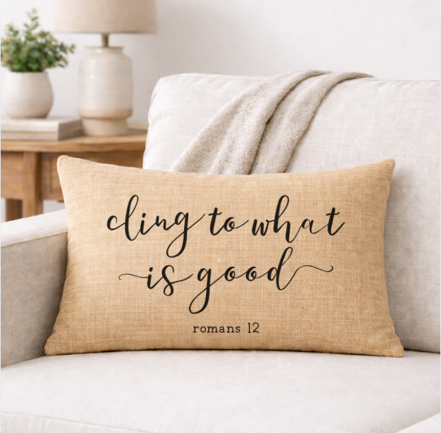 Bring faith and comfort into your home with our Cling to What is Good linen throw pillow. Designed with a soft neutral tone and bold cross-centered typography, this pillow adds meaningful style to sofas, chairs, beds, and reading nooks.
