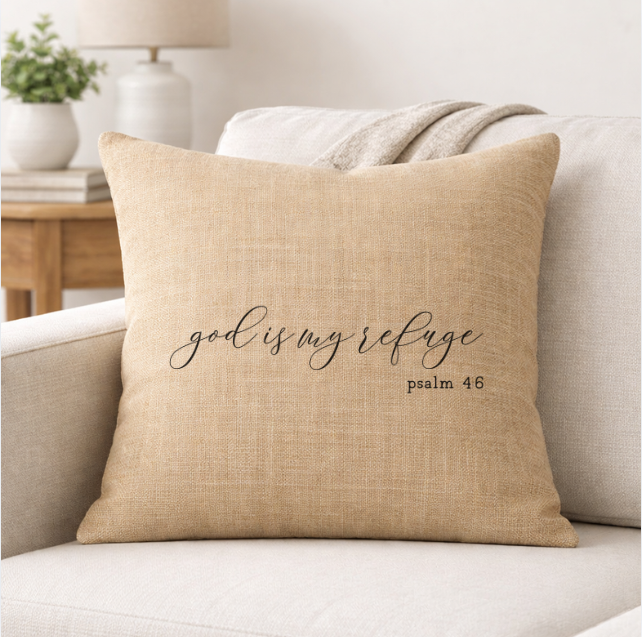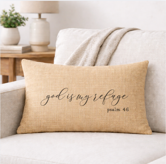 Bring faith and comfort into your home with our God is My Refuge linen throw pillow. Designed with a soft neutral tone and bold cross-centered typography, this pillow adds meaningful style to sofas, chairs, beds, and reading nooks.