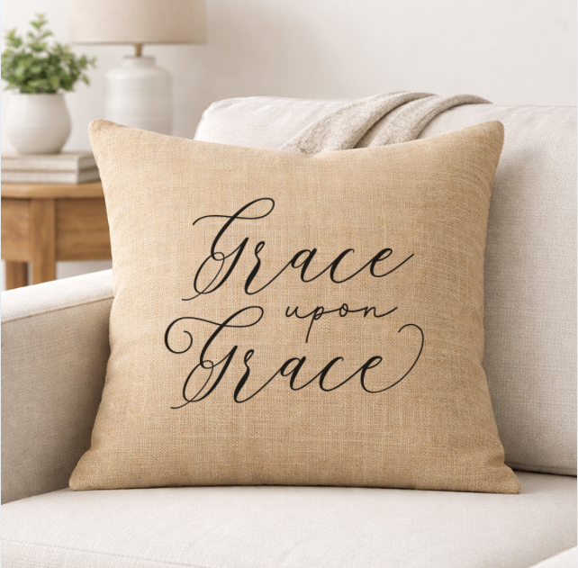Bring faith and comfort into your home with our Grace Upon Grace linen throw pillow. Designed with a soft neutral tone and bold cross-centered typography, this pillow adds meaningful style to sofas, chairs, beds, and reading nooks.