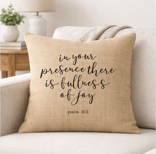 Bring faith and comfort into your home with our Psalm 16:11 linen throw pillow. Designed with a soft neutral tone and bold cross-centered typography, this pillow adds meaningful style to sofas, chairs, beds, and reading nooks.